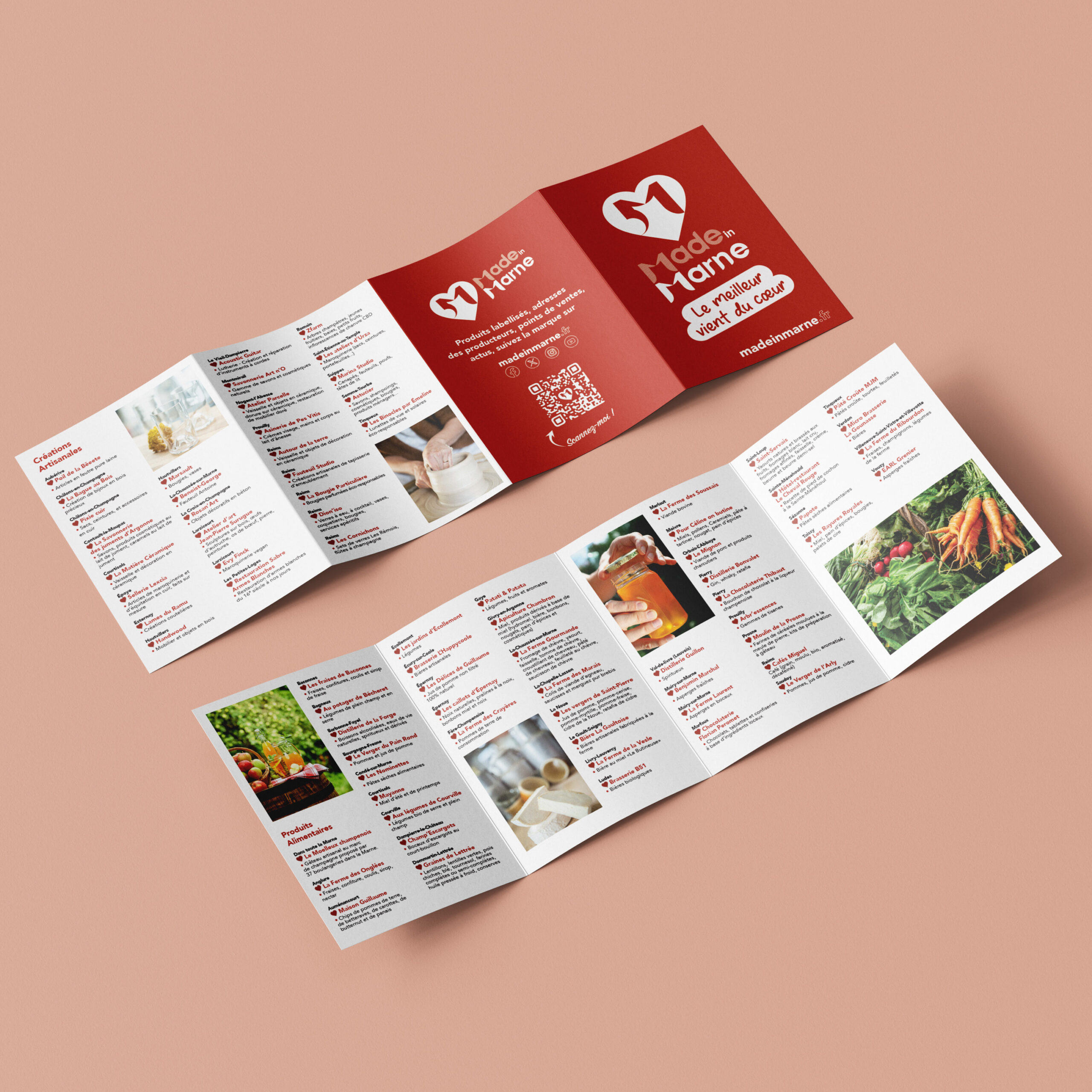 Déclinaisons de la charte graphique du label Made In Marne sur les différents supports de communication. Un label créé pour mettre en avant les artisans et les producteurs marnais sur différents évènements (marchés de Noël, Foire de printemps, Foire de Châlons…).